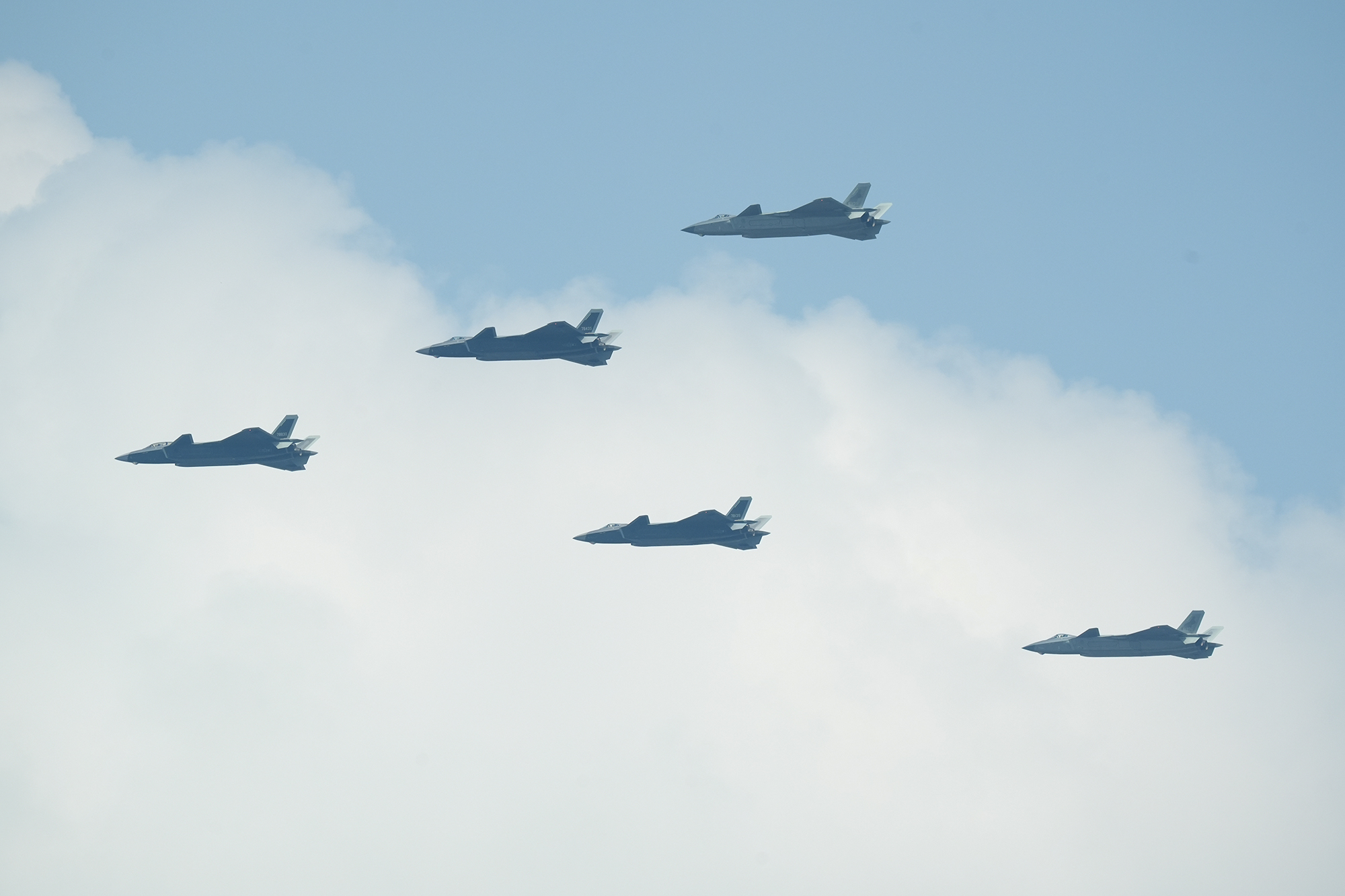 殲擊機(jī)梯隊(duì)接受檢閱。殲16D、殲20、殲35A、殲20S、殲20A,編成兩個(gè)楔隊(duì)震撼亮相。攝影:鄭宇航